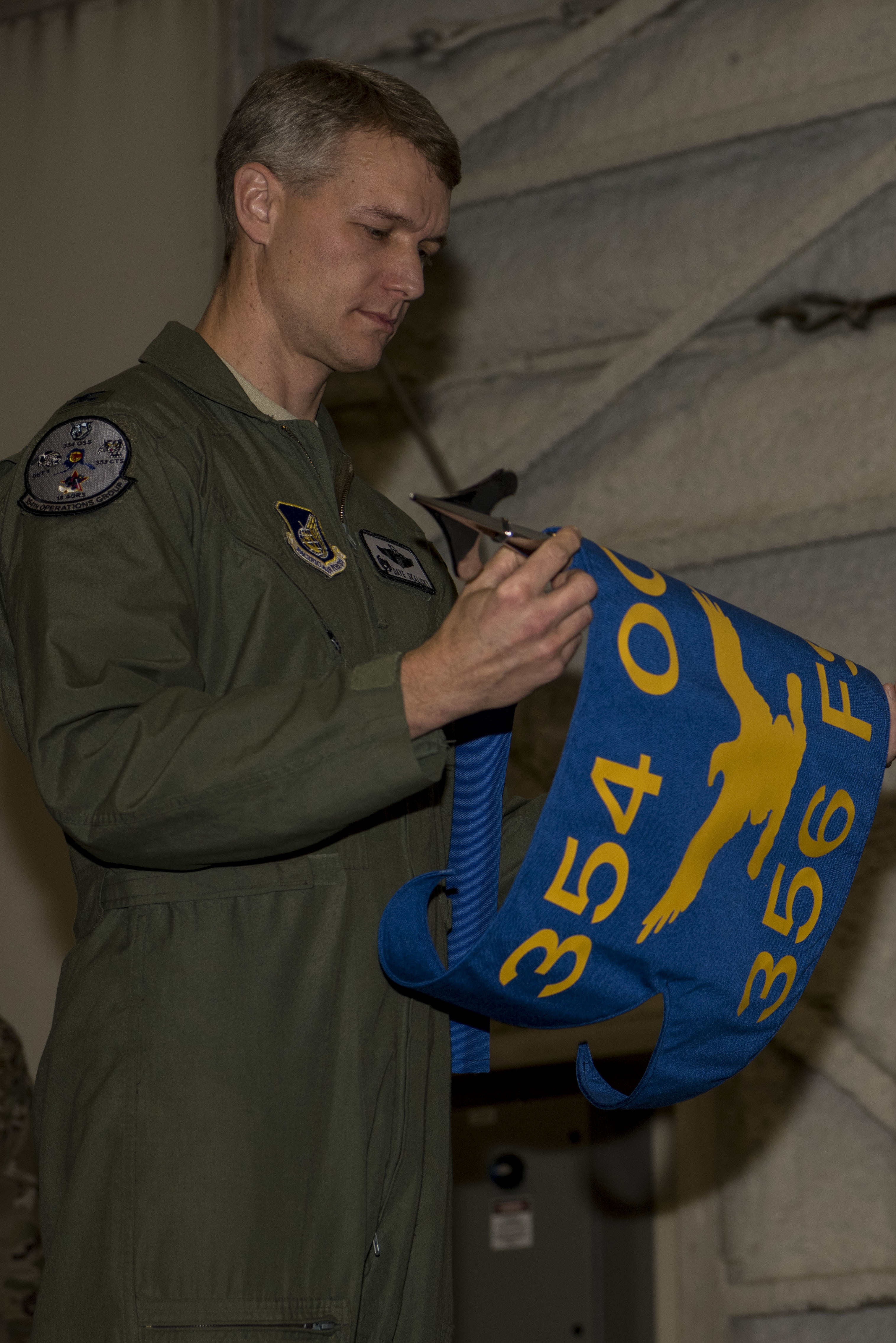 U.S. Air Force Col. David Skalicky, 354th Operations Group commander, unfurls the 356th Fighter Squadron (FS) guidon during a squadron reactivation ceremony at Eielson Air Force Base, Alaska, Oct. 10, 2019. The 356th Tactical Fighter Squadron was previously stationed in the Pacific for both the Vietnam Conflict, and to defend Korea and Japan out of Kunsan Air Base and Misawa Air Base respectively. (U.S. Air Force photo by Airman 1st Class Aaron Larue Guerrisky)