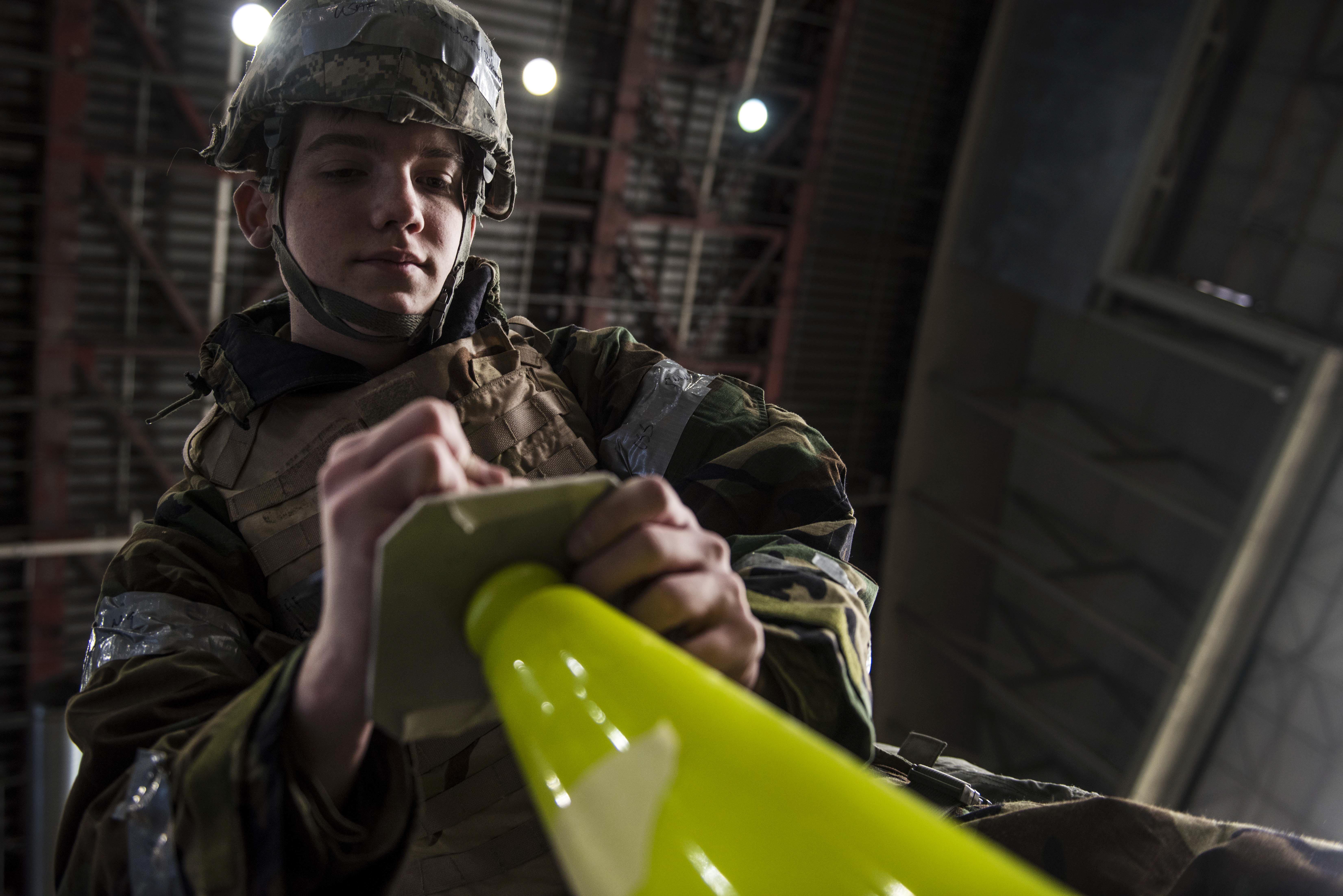 U.S. Air Force Airman 1st Class Zachary Rodgers, a 354th Operations Support Squadron airfield management shift lead, marks a chemical detection stanchion during the ability to survive and operate (ATSO) training portion of Exercise Golden Raven 20-1 at Eielson Air Force Base, Alaska, Feb. 27, 2020. The M8 paper placed onto chemical detection stanchions are used to detect the type and concentrate of a chemical agent. (U.S. Air Force photo by Airman 1st Class Aaron Larue Guerrisky)