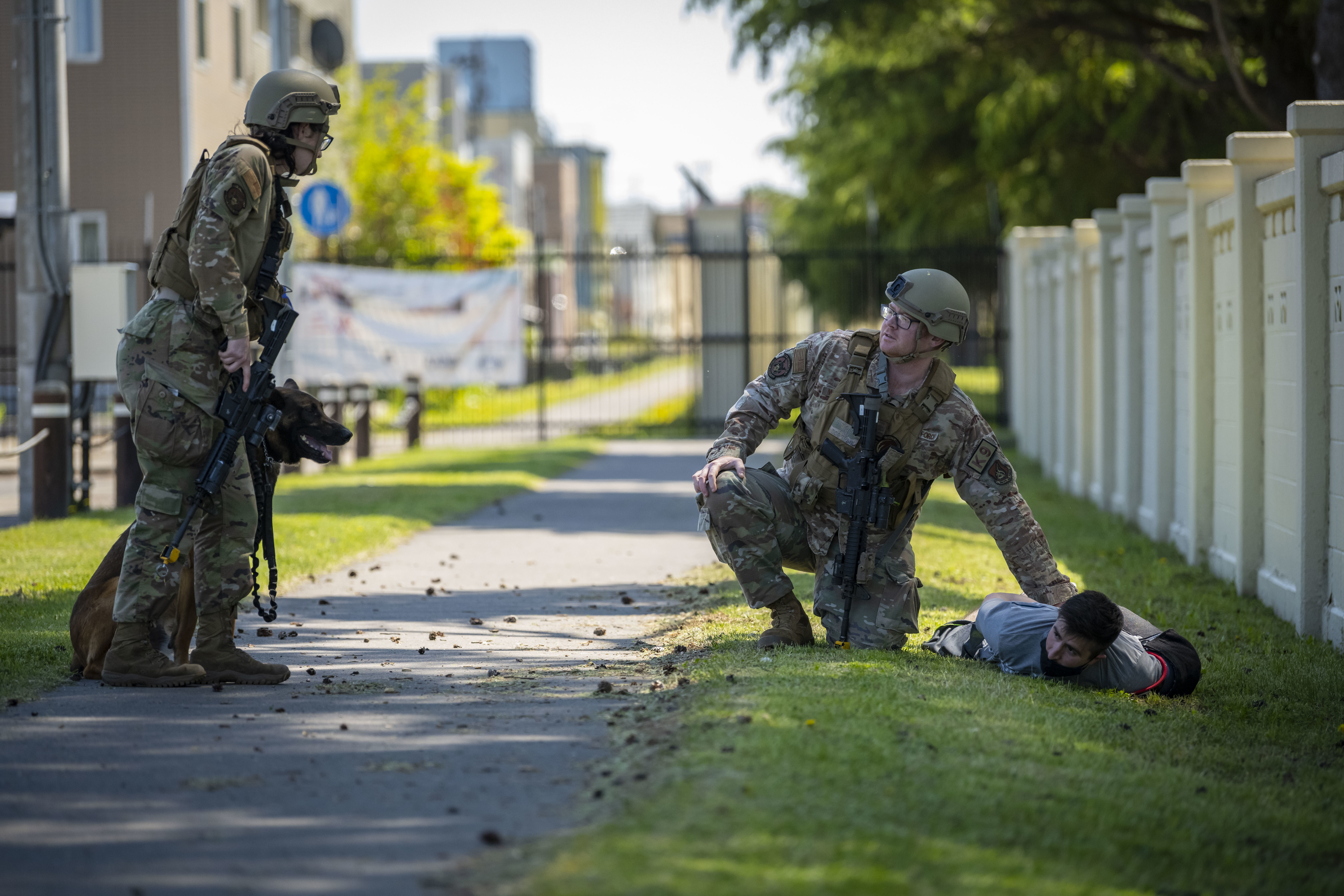 U.S. Airmen assigned to the 35th Security Forces Squadron simulate a capture and restrain of a protestor who broke through the gate during Exercise Beverly Sunrise 22-04 at Misawa Air Base, Japan, May 10, 2022. The exercise tested Airmen’s abilities to support Agile Combat Employment concepts to ensure forward-deployed forces in the Indo-Pacific region are ready to protect and defend the United States, allies and partner interests at a moment’s notice. (U.S. Air Force photo by Airman 1st Class Leon Redfern)
