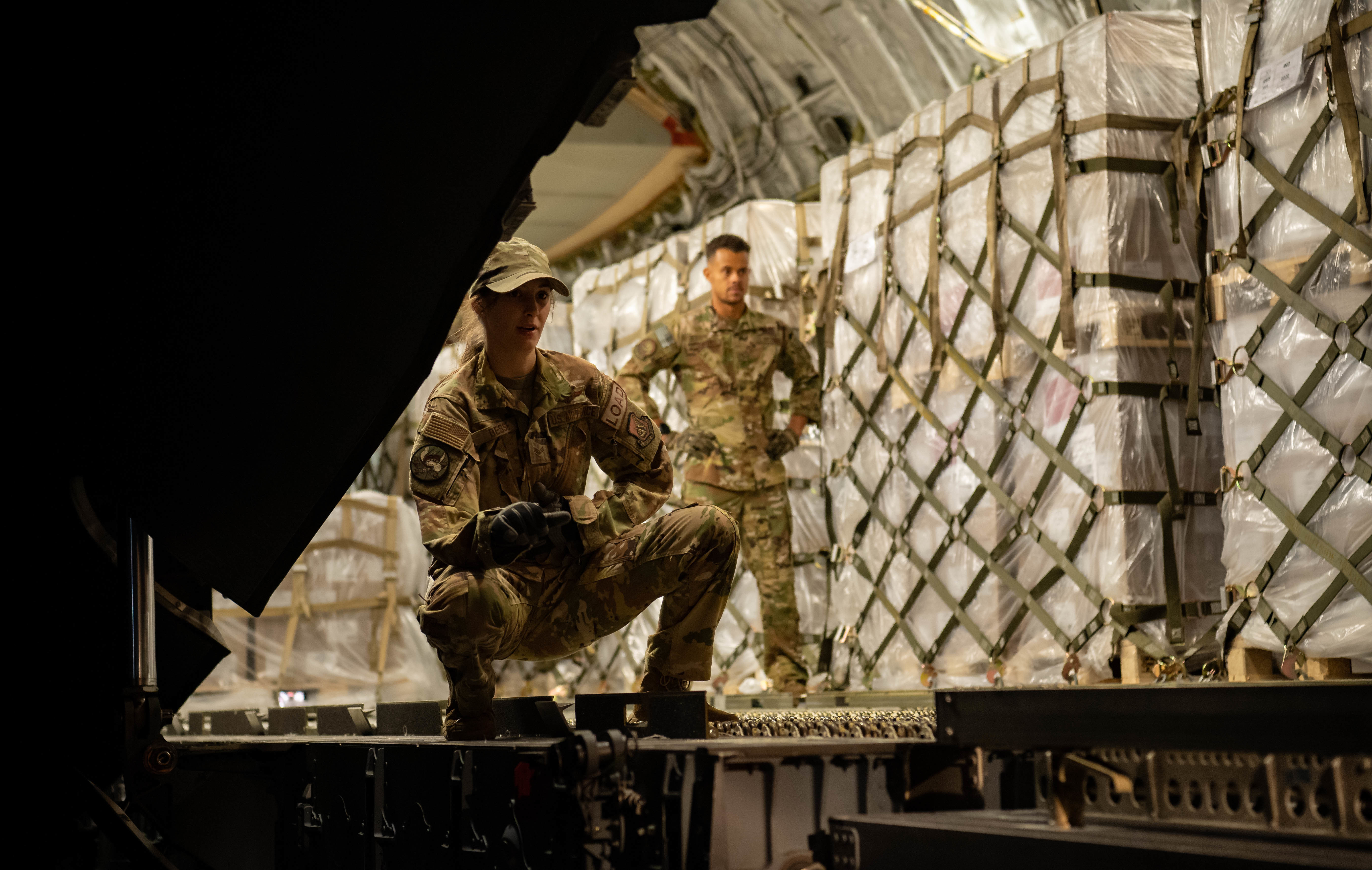 Senior Airman Jolan Besse, 721st Aerial Port Squadron loadmaster, assists Airmen as they load infant formula onto a C-17 Globemaster lll aircraft assigned to Joint Base Pearl Harbor-Hickam, Hawaii, at Ramstein Air Base, Germany, May 22, 2022. The infant formula arrived from Switzerland as part of the U.S. Government’s Operation Fly Formula to rapidly transport infant formula to the United States due to critical shortages there. Under Operation Fly Formula, the USDA and the Department of Health and Human Services are authorized to request Department of Defense support to pick up overseas infant formula that meets U.S. health and safety standards. (U.S. Air Force photo by Airman 1st Class Jared Lovett)