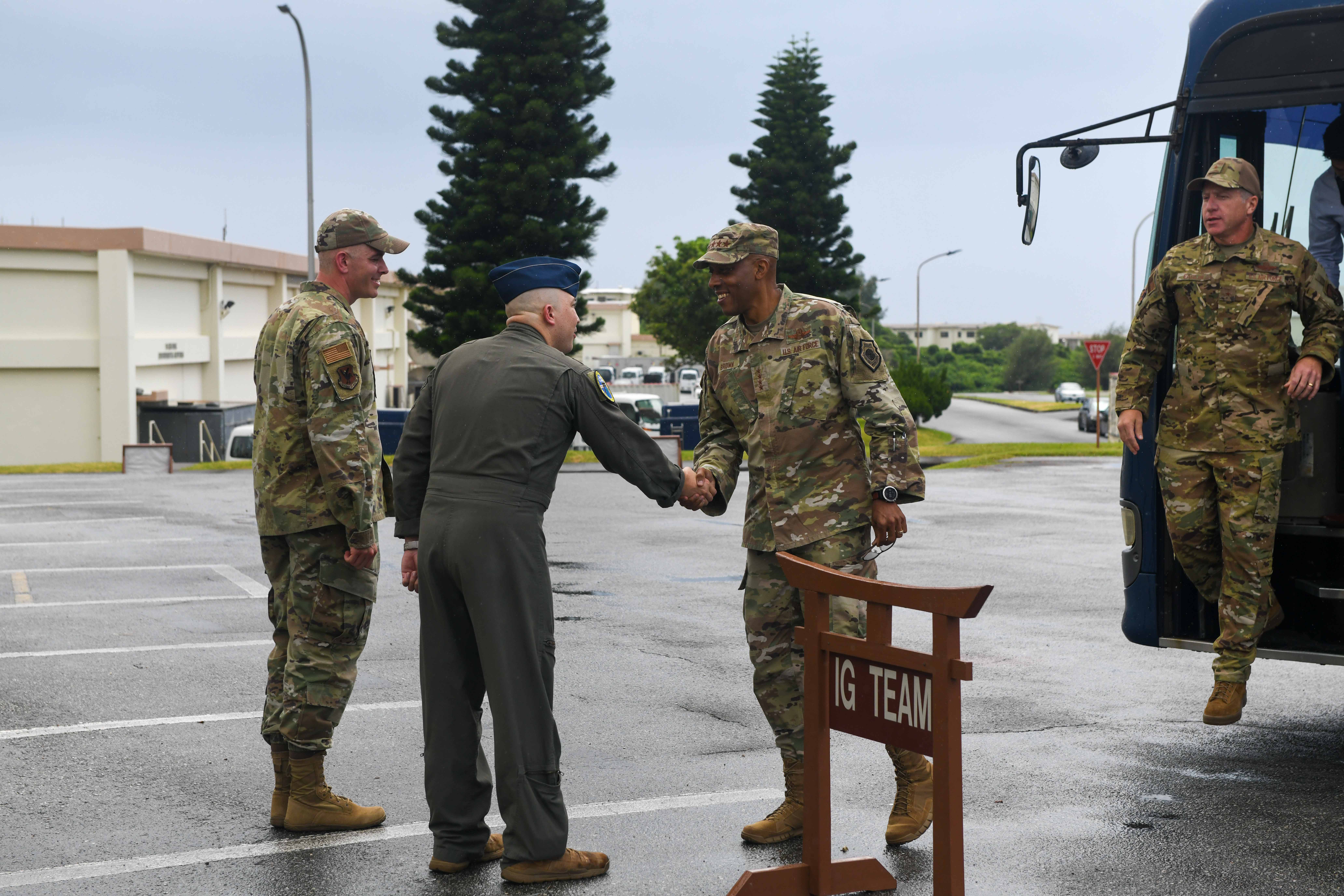 Air Force Chief of Staff Gen. CQ Brown, Jr., greets U.S. Air Force Maj. Erik "Sparky" Cadorette, director of 18th Wing ACE, during his visit to Kadena Air Base, Japan, August 11, 2022. Brown discussed Kadena’s cooperative activities that deepen interoperability and integration between the department of the Air Force and regional allies and partners. (U.S. Air Force photo by Airman Alexis Redin)